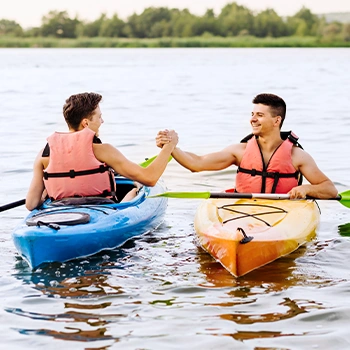 Oferujemy szeroki wybór kajaków, w tym jednoosobowych, dwuosobowych, rowerki wodne z i bez zjeżdżalni.